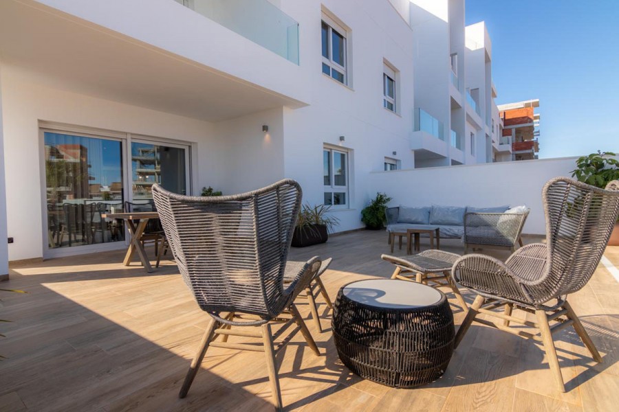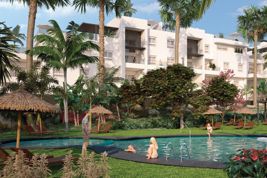 Bali Residential is a new development on two and three-bedroom homes in the Punta Prima area of the southern Costa Blanca. This property comprises of two double bedrooms, two bathrooms (en-suite to the master bedroom), fully-fitted modern integrated kitchen (with breakfast bar/island) and open-plan living/dining room, leading to either a spacious garden (ground floor apartments) or terrace (middle floors). Each property has an optional underground parking space/storage room available to them. The development benefits from an exclusive and unique communal area including two swimming pools with built-in sun-loungers and water jets, children's pool, a small decorative lake with a rest area and wooden platform, children's play area, Jacuzzi, sauna, inside/outdoor gym, multi-function cage "Street Workout" and cycle/walking paths.