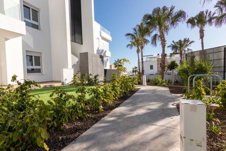 Bali Residential is a new development on two and three-bedroom homes in the Punta Prima area of the southern Costa Blanca. This property comprises of two double bedrooms, two bathrooms (en-suite to the master bedroom), fully-fitted modern integrated kitchen (with breakfast bar/island) and open-plan living/dining room, leading to either a spacious garden (ground floor apartments) or terrace (middle floors). Each property has an optional underground parking space/storage room available to them. The development benefits from an exclusive and unique communal area including two swimming pools with built-in sun-loungers and water jets, children's pool, a small decorative lake with a rest area and wooden platform, children's play area, Jacuzzi, sauna, inside/outdoor gym, multi-function cage "Street Workout" and cycle/walking paths.
