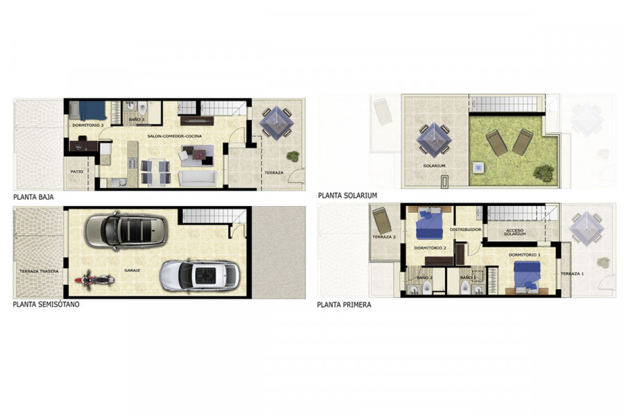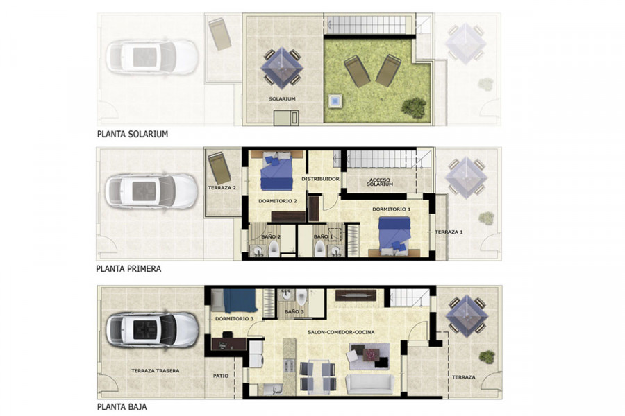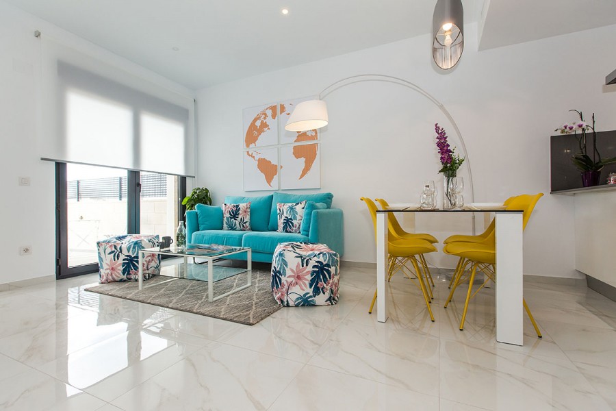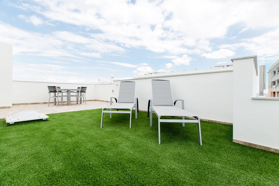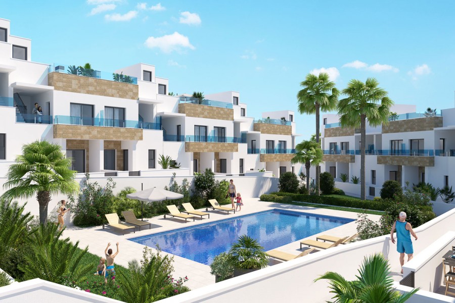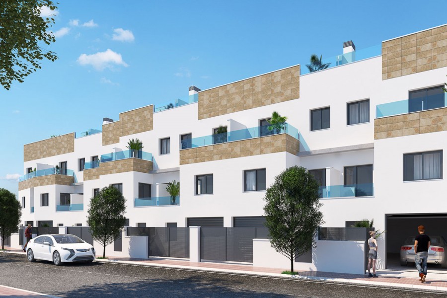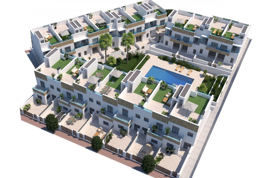 Don Benito is a new development of three-bedroom townhouses in Bigastro, a small town in the Vega Baja, just south of Alicante. The properties comprise of three double bedrooms (one on the ground floor and two on the first floor, both with access to a terrace) including fitted wardrobes, three bathrooms (en-suite to the master bedroom), separate fully-fitted modern kitchen with access to a front patio and spacious open-plan living/dining room, leading to a large terrace (part of which is covered). The properties also boast a fantastic rooftop solarium to enjoy the Spanish sunshine from and offer the option of a two-car garage in the basement. The development benefits from a communal swimming pool and landscaped gardens, to which all properties have direct access.