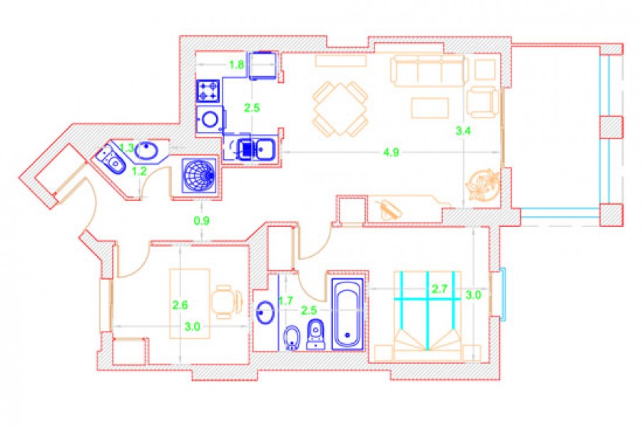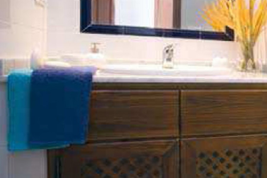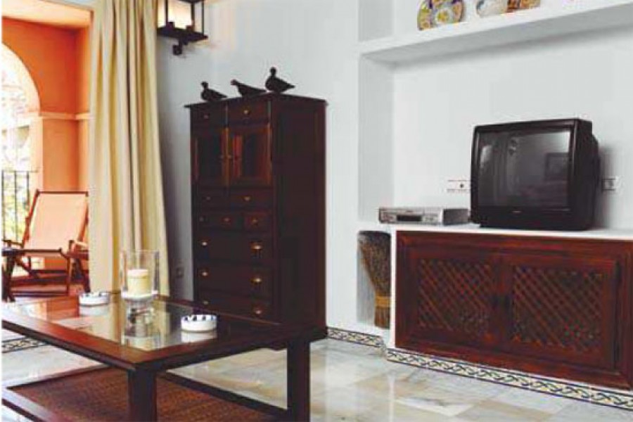 Les appartements sont de style méditerranéen, avec des poutres en bois dans le salon, sols en marbre, placards et étagères, etc.