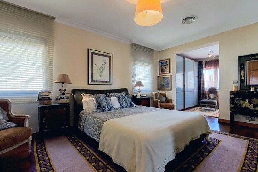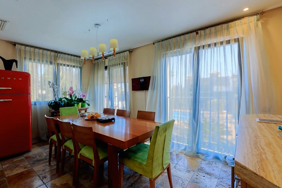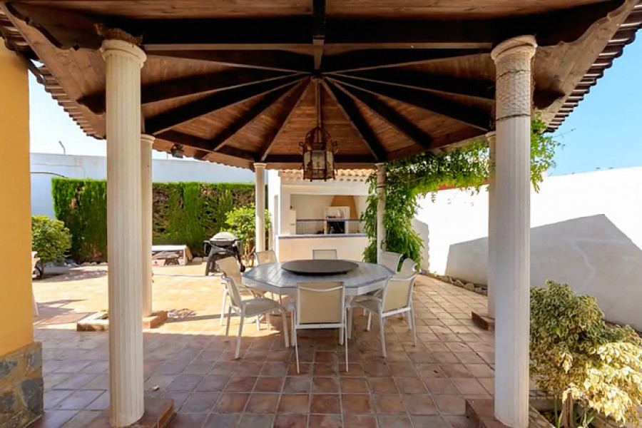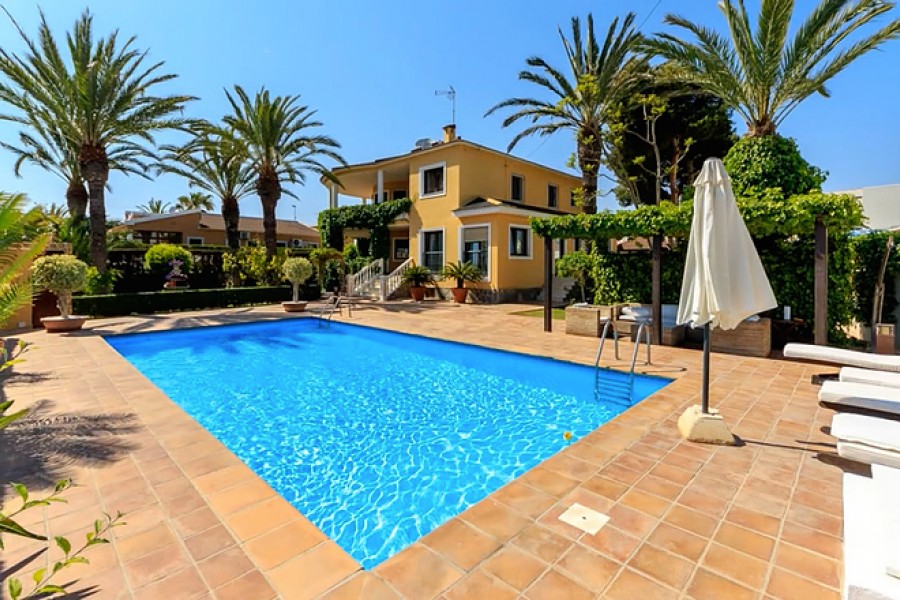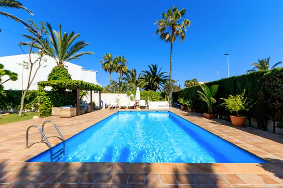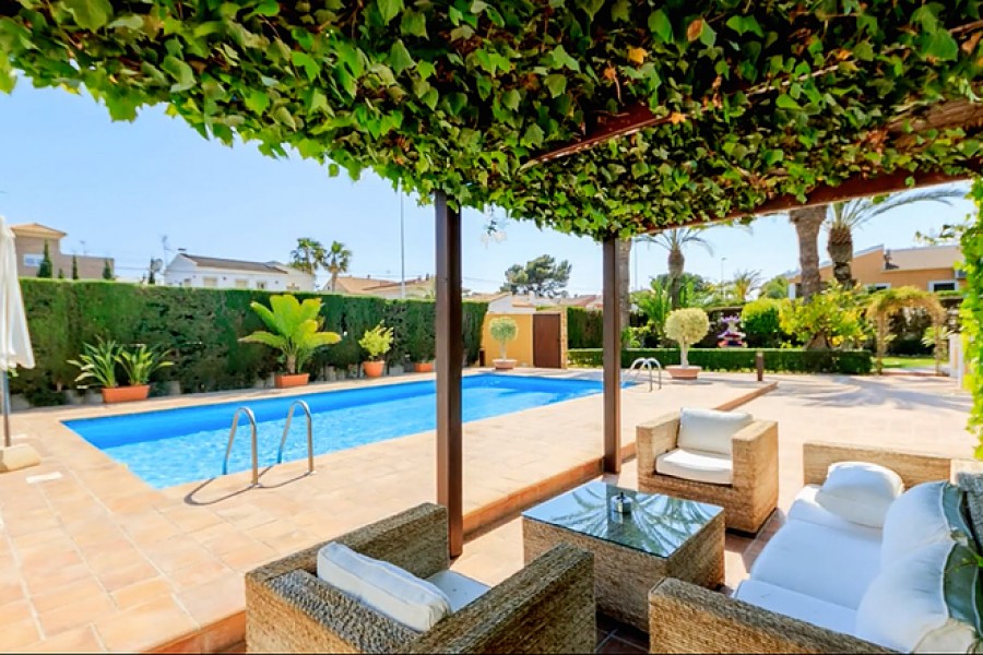Casa Primavera is a very spacious detached villa, on a 1044m2 plot, in Torrevieja and within walking distance of the beach. The 400m2 luxuriously-furnished property comprises of three double bedrooms, dressing room to the master bedroom, two full bathrooms (one with corner bath-tub), separate guest toilet, den, dining room, large basement (currently being used as a home gym), spacious living room with library area and fully-fitted separate kitchen (with island), leading to the beautifully landscaped garden with covered outside dining area, private swimming pool, off-street parking and car port (for one car).